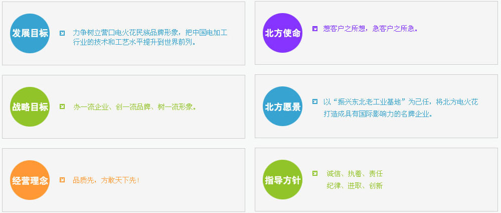 北方電火花本著“進(jìn)取、務(wù)實(shí)、誠信、執(zhí)著” 的宗旨,力求不斷創(chuàng)新,確保以卓越的產(chǎn)品質(zhì)量和優(yōu)質(zhì)的服務(wù)開拓市場。北方從創(chuàng)業(yè)之初的作坊式管理正在向公司規(guī)范化管理過渡,以相應(yīng)的組織體系來保證決策的科學(xué)化,實(shí)施執(zhí)行決策的權(quán)威化,既保證決策科學(xué)性全面性,又能保證實(shí)施執(zhí)行決策的有效性。經(jīng)營方面遵循專業(yè)化,始終是以EDM技術(shù)為核心展開經(jīng)營活動。人力資源方面,北方提供挑戰(zhàn)及學(xué)習(xí)的環(huán)境,發(fā)揮員工潛力,使公司整體能力提升,進(jìn)而經(jīng)由創(chuàng)新和團(tuán)隊(duì)合作相結(jié)合,提供客戶最具市場競爭力的產(chǎn)品和研發(fā)技術(shù),并以國際化的視野和展望,運(yùn)用本地資源整合,成為電加工設(shè)備研發(fā)生產(chǎn)銷售的領(lǐng)導(dǎo)廠商。惟有最好的產(chǎn)品品質(zhì)及最熱誠的服務(wù)態(tài)度及工作效率,才能創(chuàng)造客戶最佳的利潤,并且回饋公司每一位員工。當(dāng)這些理念付諸實(shí)行之后,且時時要求員工遵守道德準(zhǔn)則,便形成北方的企業(yè)文化。